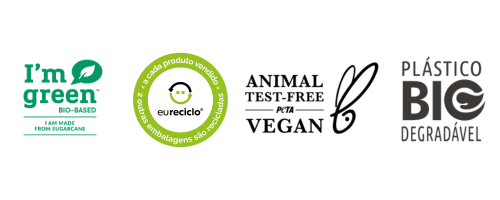 Formulado com ingredientes hipoalergênicos, veganos, biodegradáveis e de origem 100% natural;